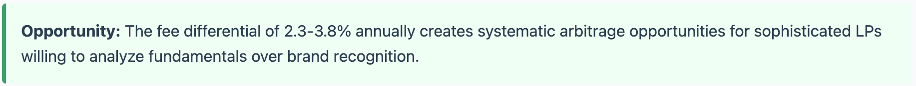 Over a 10-year investment horizon, that compounds to approximately $180,000 less wealth creation per $1M invested. Which raises interesting questions about what "institutional quality" actually means for beneficiaries.